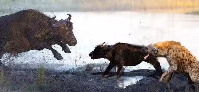 於是在慌亂之中跑到了一群野牛的棲息地內。這群野牛見狀之後並沒有伸出援助之手,反而將這只角馬給頂翻在地,讓鬣狗有了可乘之機。大概可能是野牛怕自身難保吧!