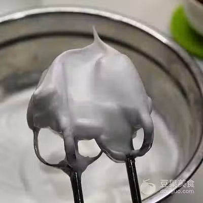 8、停止打蛋器,垂直放進盆里轉兩圈再提起來,看到這樣垂直的小尖就可以了,然後低速整理一下蛋白霜,盡量不要有結塊的。