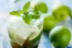 薄荷葉若干,白朗姆酒,青檸,黃檸檬,薄荷糖漿,蘇打水,白糖,冰塊