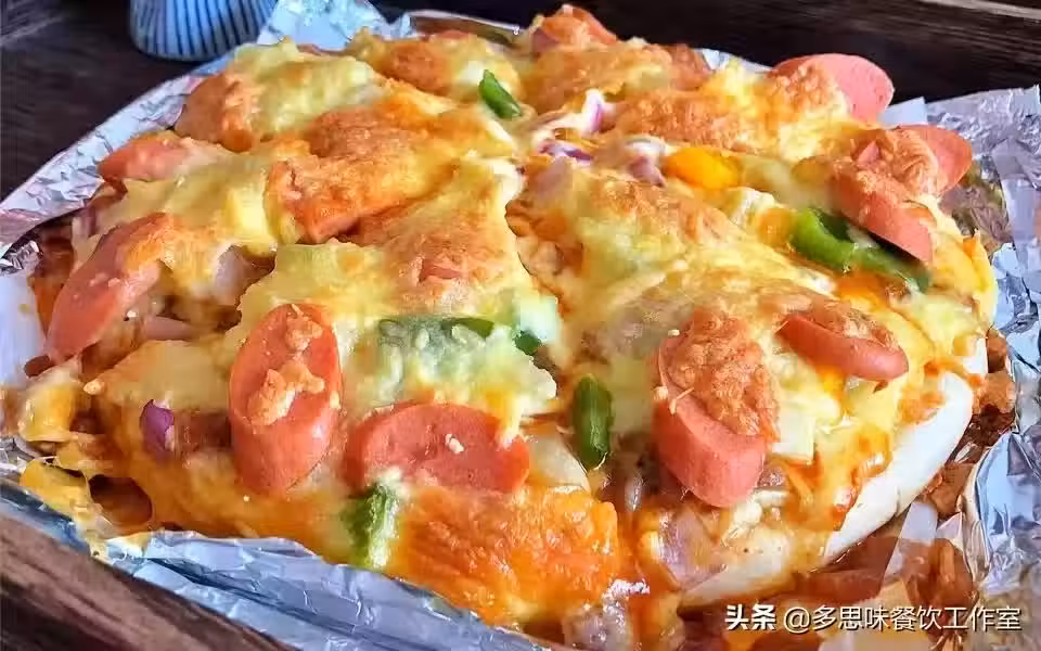 4、依次放入土豆塊和綠黃柿子椒,洋蔥丁,再鋪一層火腿片,最上面鋪一層芝士。