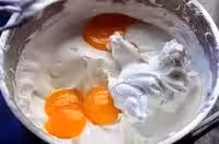 9.蛋白霜和蛋黃混合打至均勻成緩慢流淌狀態時,篩入低筋麵粉,邊轉動打蛋盆邊用刮刀從底往上對角切拌;