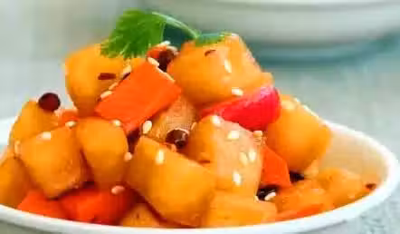 1、白蘿蔔、胡蘿蔔去皮切成指頭大小丁,櫻桃小蘿蔔切成指頭大小丁