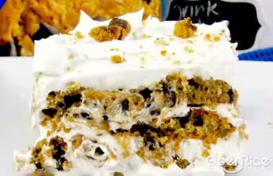 2.把餅乾覆蓋 9」 × 13」 鍋底,接著鋪上一層打發好的奶油。重複兩次以上,直到容器盛滿。