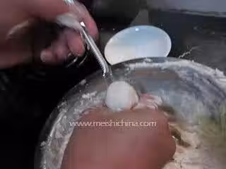 12. 攪好的魚蓉用手擠出丸子