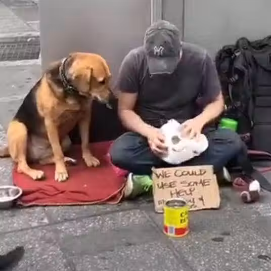男子帶狗狗一起流浪,喂狗狗食物時,狗狗讓主人先吃,牠好懂事
