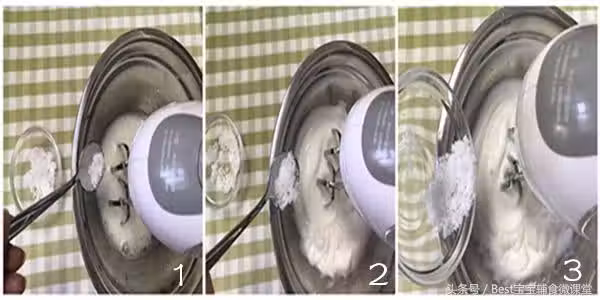 step6:蛋清中分三次加入白糖,分別是蛋白出現粗泡、細膩和紋路時加入糖。