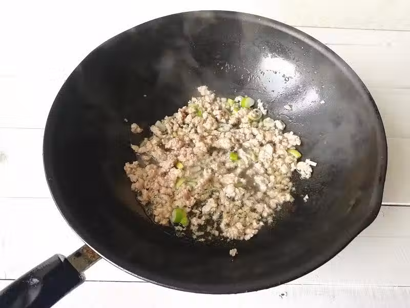 4.鍋加油燒熱,下入蔥花,薑末,蒜片爆香,在下入肉末小火炒制變白