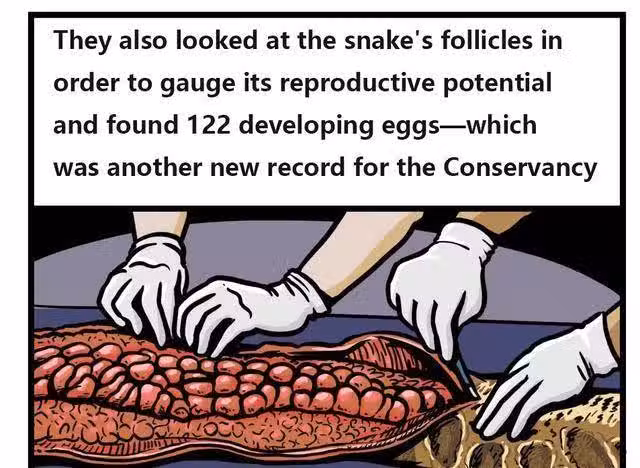 同時還在巨蟒體內發現 122 個正在發育、大致呈球形的「卵泡」。這又是一項新的記錄,緬甸蟒平均一次產下 45 個卵。