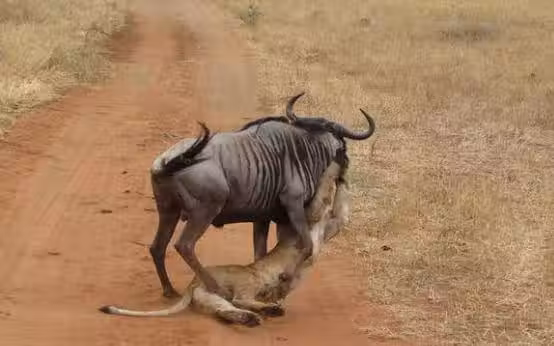 看到這樣的一幕我都驚呆了,這是什麼情況,角馬身下居然拖著一隻獅子,問題是它居然還怕踩著它了。