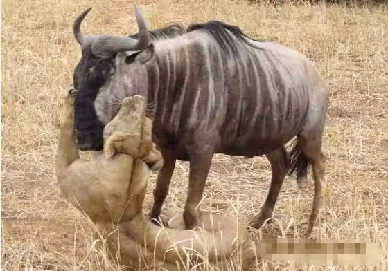 只見獅子死死的咬著角馬的脖子,但是它好像無所謂一樣,依舊在走路,為什麼不反擊呢?