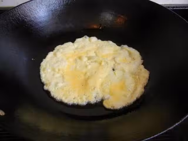 3.鍋里油熱,放下蛋液炒熟盛出.