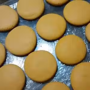 9、做好的南瓜餅胚平底鍋放少許油,小火煎熟,裝盤,要小火,不然很容易糊鍋