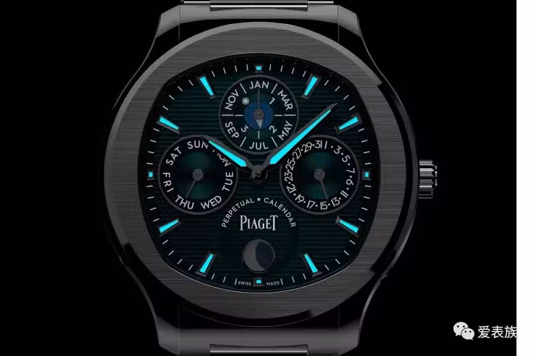 新款 Piaget的錶盤為當前流行的翠綠,配置gadroon 圖案水平條紋;萬年曆子錶盤為位於 3 點鐘位置的日期盤,9 點鐘位置的星期盤,以及12 點鐘位置的月份和閏年顯示,月相視窗位於6點鐘位置。小錶盤融合了多種飾面,隨著光線的照射增添了豐富的視覺效果。為了平衡布局,伯爵的設計師選擇了帶有「萬年曆」字樣的扁平圓環,圓圈內有「Piaget」文字標識和月相顯示。時針、分針和時標均塗有 Super-LumiNova 夜光塗層,其形狀便於在黑暗中讀取時間。