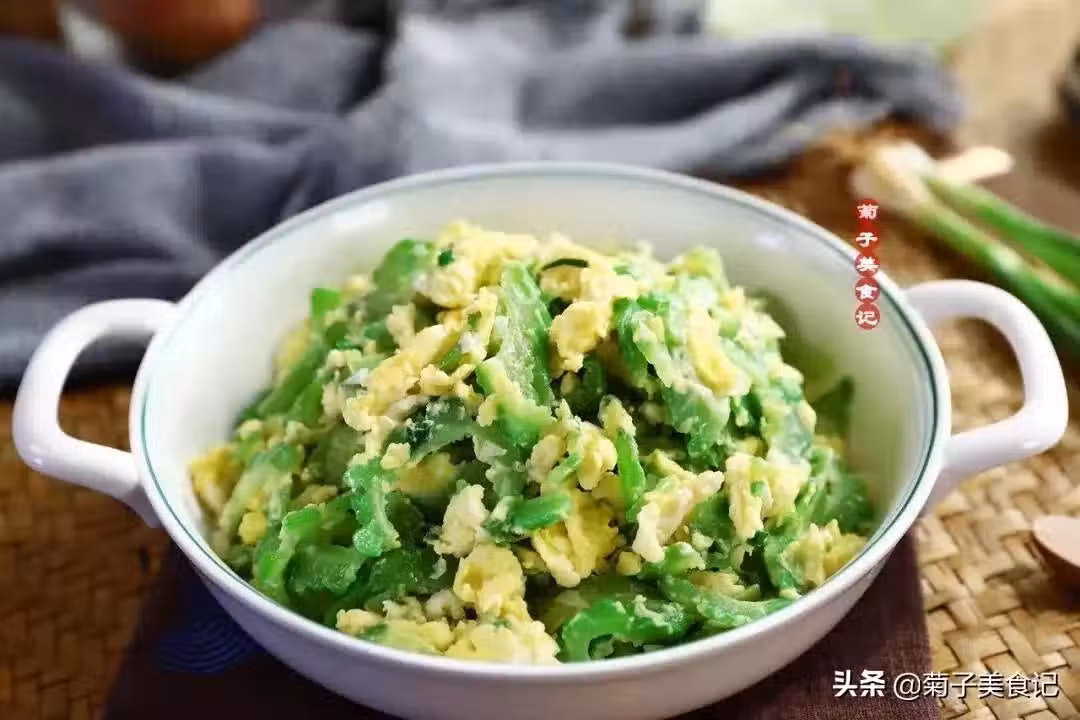 第三步:鍋中下油燒熱,先下蒜末煸出香味,再下苦瓜片翻炒一分鐘,倒入雞蛋液定型後再翻炒均勻,最後調入糖和少許鹽炒勻即可盛盤上桌,一道健康美味的苦瓜炒雞蛋就做好了