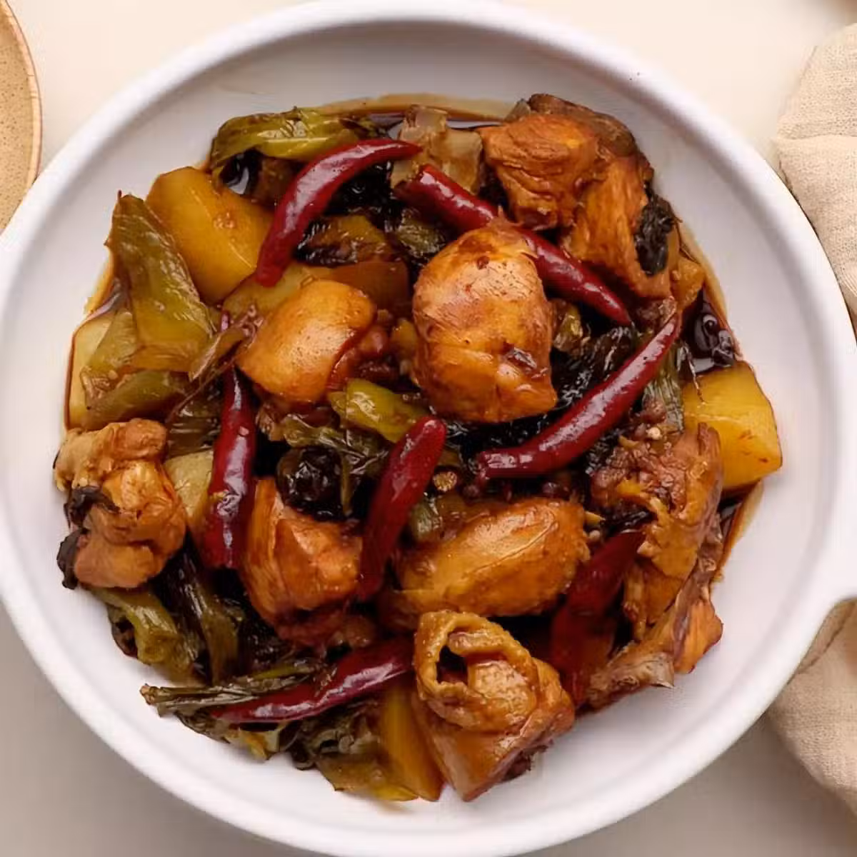 油鍋燒熱,倒入大蒜、花椒、干辣椒煸香,加入雞塊,倒入生抽、老抽、鹽、白糖,翻炒均勻。
