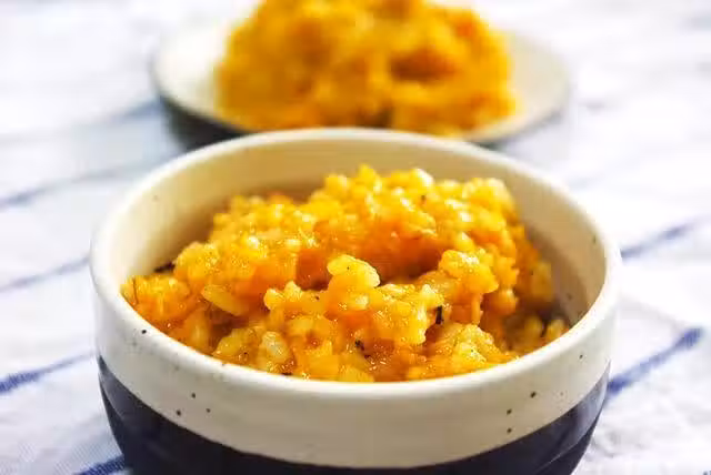 用鍋鏟把南瓜和米飯混合起來。