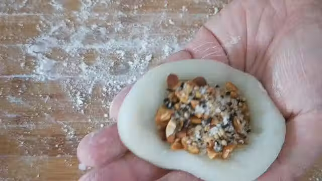22、再像包包子一樣把封口處捏合緊實,再放到面板上團圓
