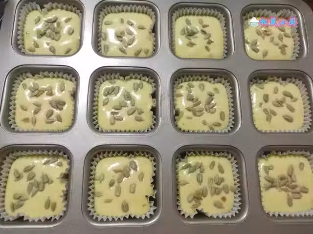 9、開始往模具中擠蛋糕糊的時候,就可以預熱烤箱了。烤箱提前10分鐘預熱,上下火180度烘烤20分鐘就好了。