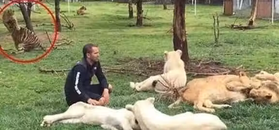 豹子以飛快的速度往飼養員身上撲,本以為它的奸計就要得逞了。可是沒想到這個時候在一旁休息的老虎卻半路殺出來,直接就把豹子給頂飛了。豹子一臉懵逼:我去,大哥你幹啥呢!飼養員聽到後面的動靜後立馬起身,但是卻絲毫不慌張。一看就是見過世面的人,這麼可怕的場景竟然沒有任何反應,如此的從容淡定。