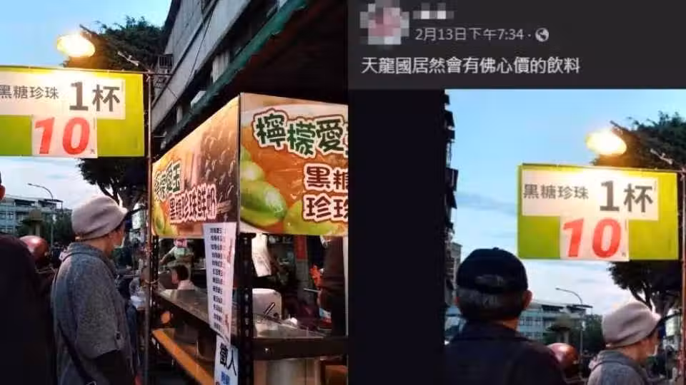 原PO在臉書社團「路上觀察學院」發文驚呼:「天龍國居然會有佛心價的飲料!」,並配上攤販照片,店家的招牌上大大寫著「黑糖珍珠1杯10元」。文章曝光後,有不少網友質疑,店家可能是在玩文字遊戲,在「黑糖珍珠1杯10元」旁可能還有「起」的小字,或是黑糖珍珠10元,但加奶茶要90元。