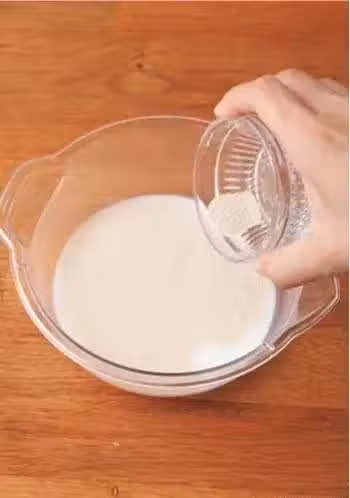02 麵粉、鹽、砂糖、絹豆腐放入另一個大碗,用橡膠鏟快速攪拌均勻。