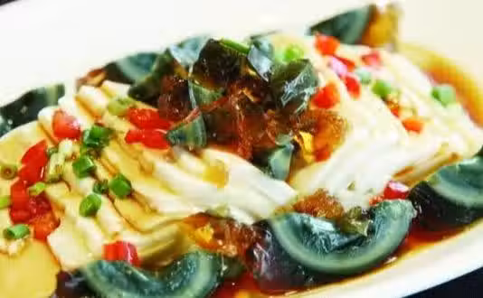 3.皮蛋去殼,切粒。然後放上已切好的豆腐上。