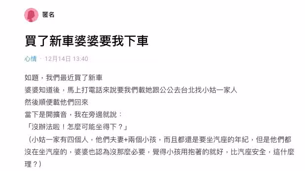 人妻補充說明,婆婆認為小孩沒必要坐汽車座椅抱著比較安全,讓她無奈直言「這什麼理?」而婆婆聽到她拒絕,竟立刻回嘴:「那你不要去啊!這樣就坐得下啊!讓人妻一秒爆氣心想:「我有沒有聽錯?車子我買的,我繳的車貸 這位大嬸你哪位?你叫我不要去?」