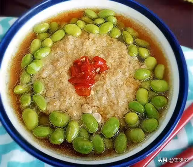 8、三十分鐘後,碗中都是湯汁,毛豆糯糯的,肉餅軟嫩,湯汁鮮美!