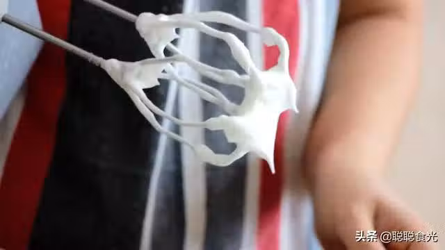 步驟七:打發到紋路清晰,有阻力的時候,關掉打蛋器,提起看一下,打蛋頭上面的蛋清呈直立尖角的時候蛋清就打好了,千萬不要打過頭,蛋清打老了,蛋糕會口感粗糙而且長不高。