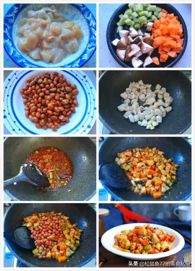 製作:雞胸肉洗凈切成雞丁,加入鹽、胡椒粉、料酒,攪拌均勻,再加1勺玉米澱粉,攪拌均勻後,加入適量的食用油封住雞丁表面,避免水分流失。黃瓜一根去皮切成丁,胡蘿蔔也要去皮切成丁,香菇切成丁待用,胡蘿蔔丁和香菇丁,過開水焯燙一下。鍋里放油,花生米下鍋小火慢慢炒熟後出鍋裝盤。鍋里放入油,油熱後倒入腌制好的雞丁,中小火炒至九分熟,這樣的雞丁最是鮮嫩,雞丁泛白但還有些未熟透就可以了,因為後面還要加熱,炒的過於熟的雞丁口感會發柴。炒鍋洗凈重新燒熱,倒入油,加入1勺郫縣豆瓣醬小火慢慢炒出紅油,下入蔥花、薑末炒香,加入米醋1勺,白糖2勺,小火慢慢炒勻。加入胡蘿蔔丁、香菇丁、雞肉丁,翻炒均勻,加入鹽1勺。需要注意的是,郫縣豆瓣醬和雞丁都是有鹽味的,加鹽要適量。把炒好的花生米放進鍋里,翻炒均勻,再加入1勺水澱粉,炒勻後出鍋裝盤即可上桌。