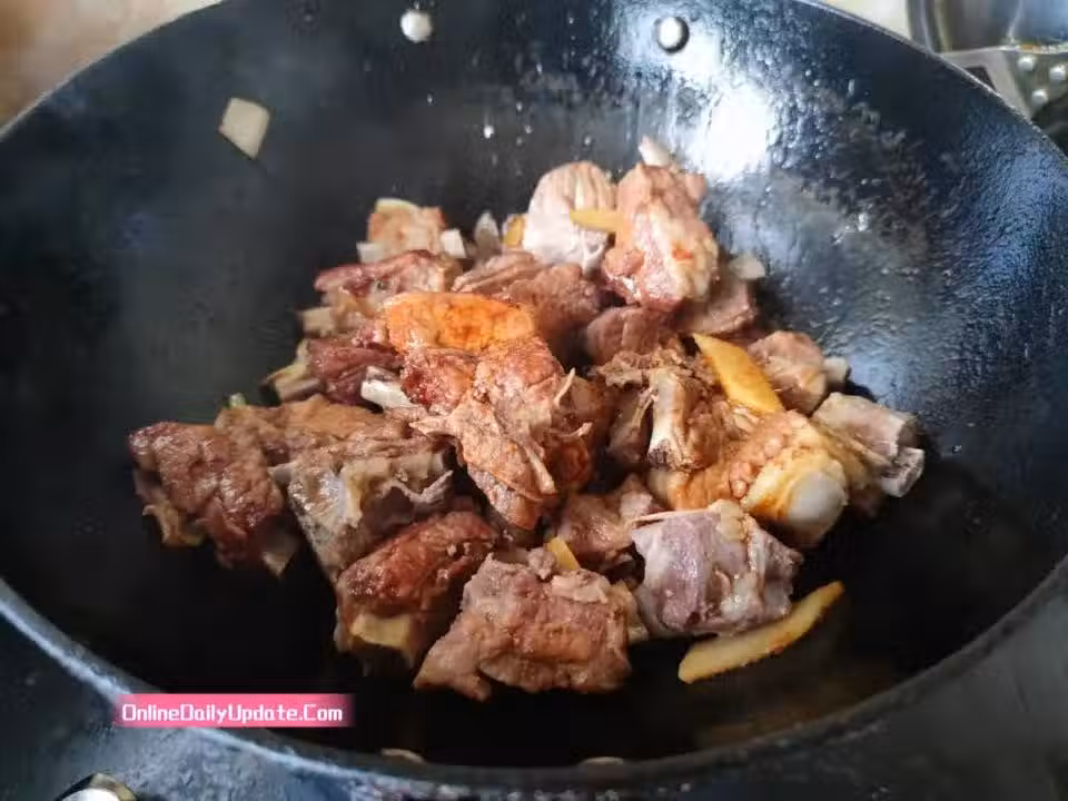 3.鍋中湯汁大火燒開,然後轉小火慢燉,燉至排骨軟爛後把年糕入鍋和鵪鶉蛋入鍋。