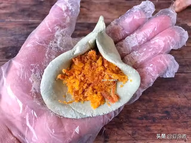 取一塊麵糰攤開包入餡料,然後密合封口。至於包成圓形還是三角形,甚至是其他形狀這個根據自己的喜好決定。