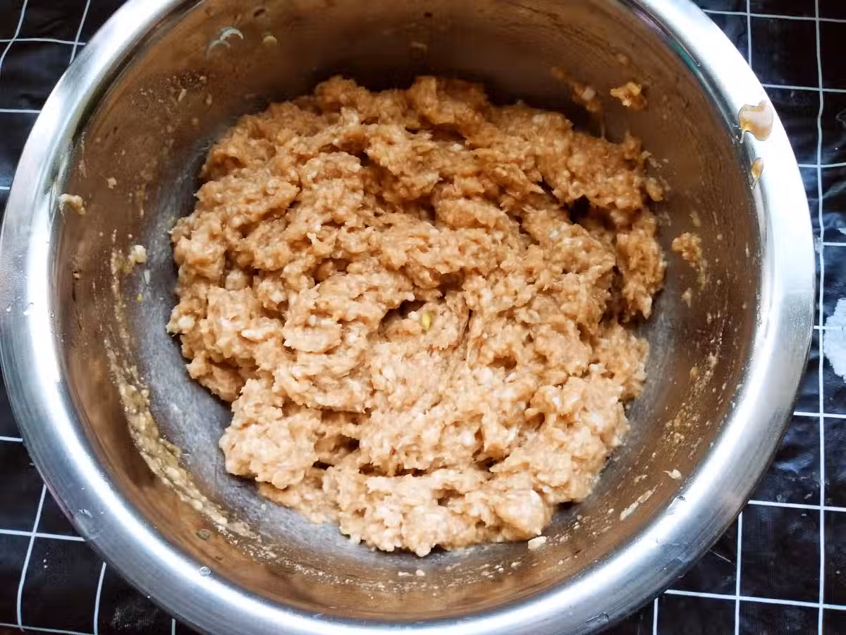 3.把剁好的蓮藕加入到肉餡中,淋上燒熱的花椒油,把蓮藕和肉餡一起攪拌均勻後即可包制。