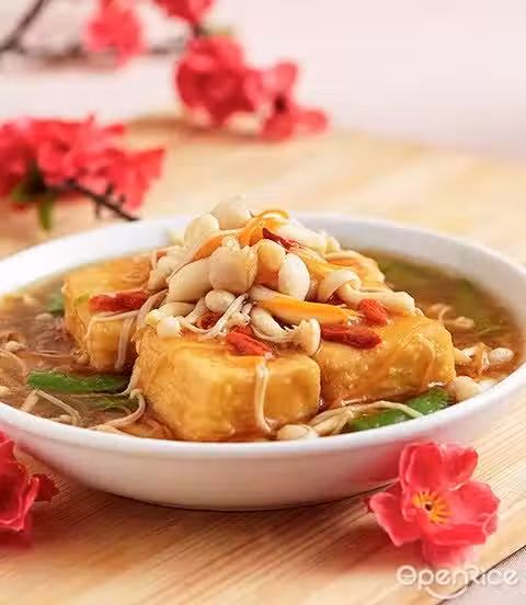 1. Deep fry tofu in hot oil until golden brown, arrange on serving plate.