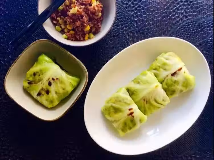 3、包菜葉~放入加了白醋和少許鹽的沸水中焯熟焯軟~瀝干水分備用~
