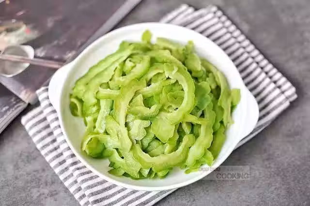 1,苦瓜洗凈後,去掉瓜瓢,切成薄片。
