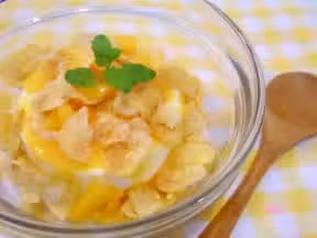 4. 接著放上芒果丁及玉米脆片就完成囉