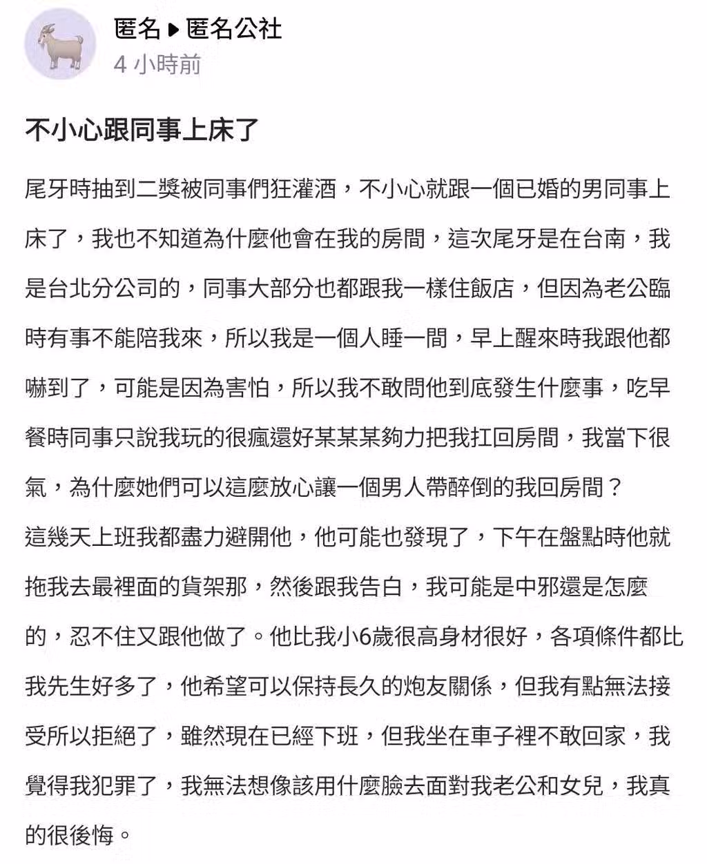 原PO後來盡力避開該名男同事,但某次對方趁她盤點時,把她拖到最裡面貨架,向她告白,而她竟也又忍不住跟對方[嘿☆咻]。她說對方比她小6歲,身材又好,各方面條件都比她的老公好,對方說想維持長久炮友關係,她拒絕後仍對家人感到愧疚,稱「我覺得我犯罪了,我無法想像該用什麼臉去面對我老公和女兒」。