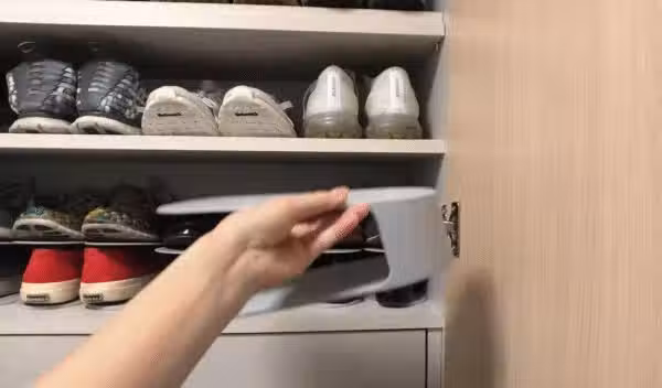 這個時候雙層鞋拖鞋架就是個好幫手,有了這個雙層鞋托以後, 一下子就將原來浪費的鞋櫃層板尺寸給用上了, 這麼說大家有點懵,看下面的對比圖大家就明白了。