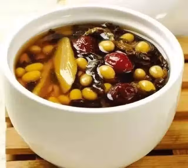食材:白菜乾200克,黃豆20克,山藥15克,紅棗10粒,花生油2茶匙,蜜棗2粒,鹽酌量,16碗水(每碗約200毫升)