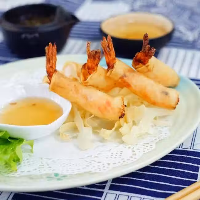 4 用春捲皮包裹住醃製好的蝦,在春捲皮的尾端抹上一點水澱粉,這樣可以使得在炸制的過程,春捲皮不散開