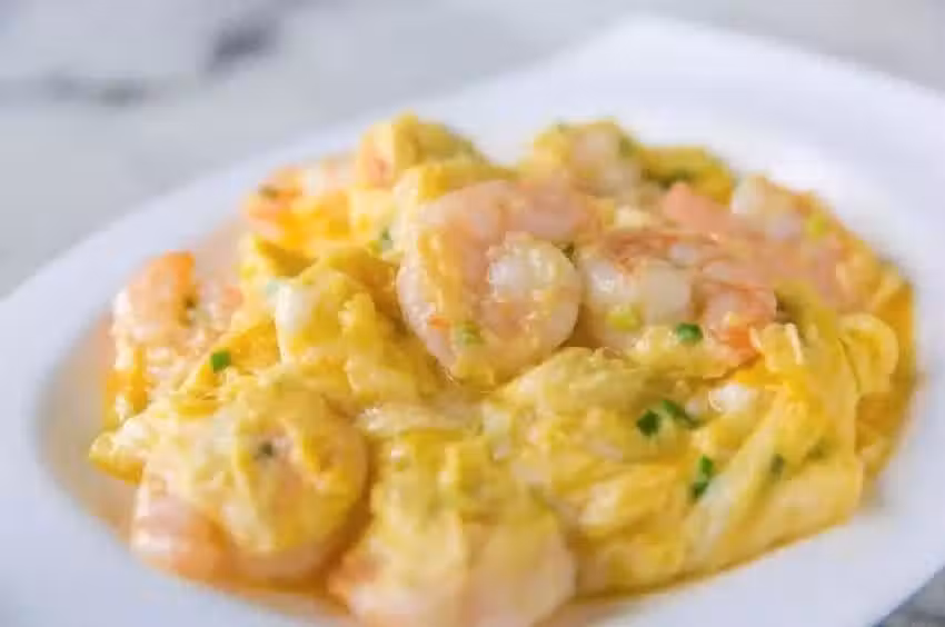 起油鍋,放入2大勺油,油燒熱後,將混合蝦仁的蛋汁倒入,一開始不要翻動,