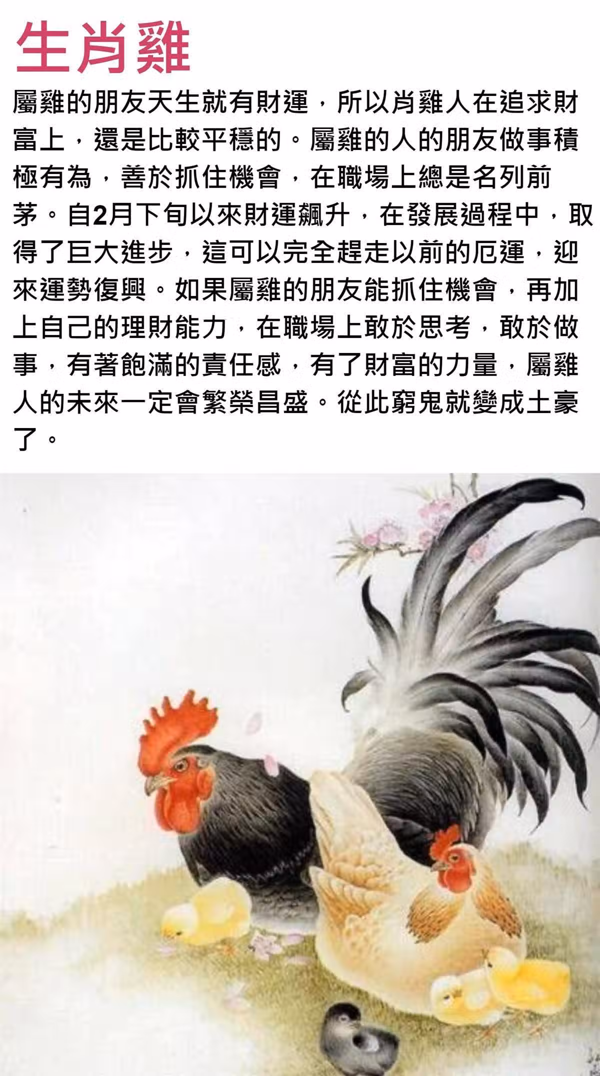 屬雞的朋友天生就有財運,所以肖雞人在追求財 富上,還是比較平穩的。屬雞的人的朋友做事積 極有為,善於抓住機會,在職場上總是名列前 茅。自2月下旬以來財運飆升,在發展過程中,取 得了巨大進步,這可以完全趕走以前的厄運,迎 來運勢復興。如果屬雞的朋友能抓住機會,再加 上自己的理財能力,在職場上敢於思考,敢於做 事,有著飽滿的責任感,有了財富的力量,屬雞 人的未來一定會繁榮昌盛。從此窮鬼就變成土豪 了。