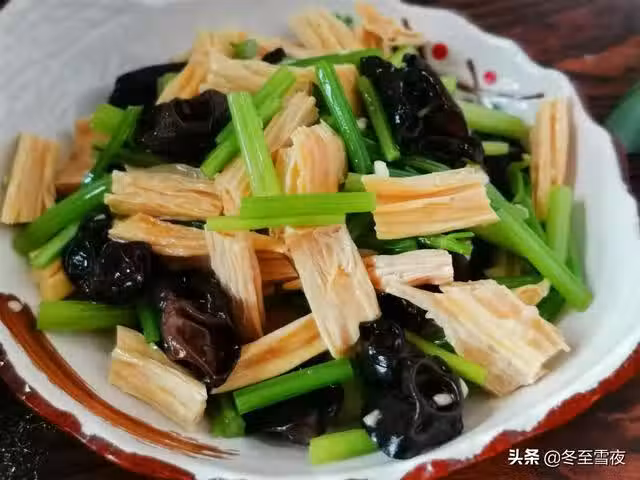 【芹菜木耳拌腐竹】所需材料:腐竹、黑木耳(干)、芹菜、油鹽、大蒜、花椒