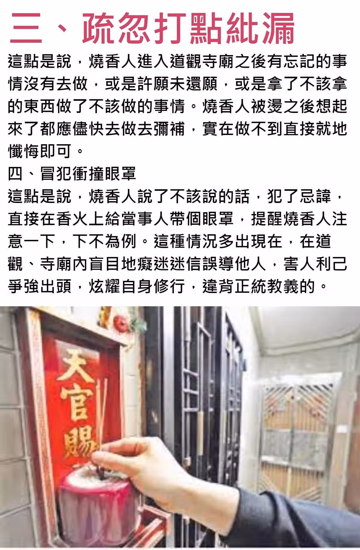 這點是說,燒香人進入道觀寺廟之後有忘記的事 情沒有去做,或是許願未還願,或是拿了不該拿 的東西做了不該做的事情。燒香人被燙之後想起 來了都應儘快去做去彌補,實在做不到直接就地 懺悔即可。