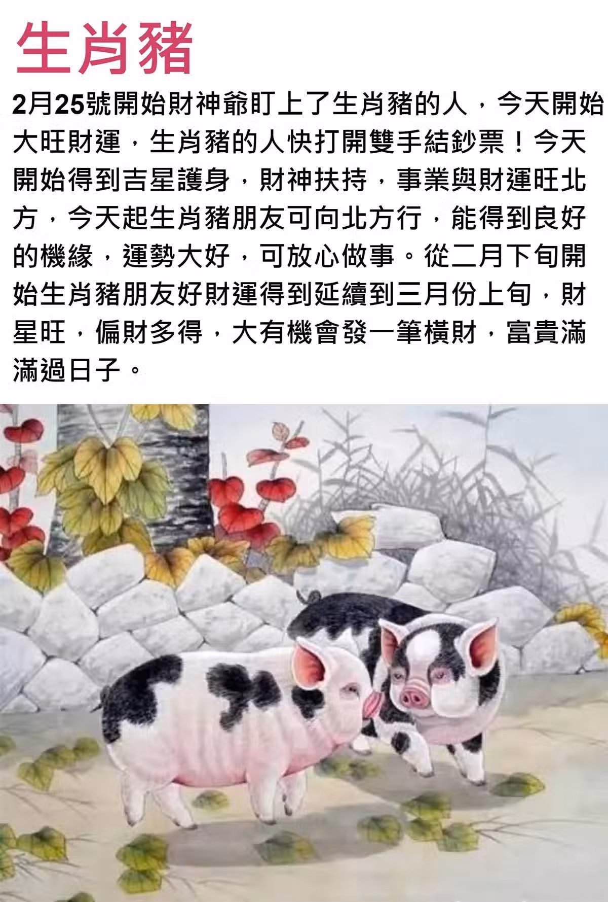 的機緣,運勢大好,可放心做事。從二月下旬開始生肖豬朋友好財運得到延續到三月份上旬,財星旺,偏財多得,大有機會發一筆橫財,富貴滿滿過日子。