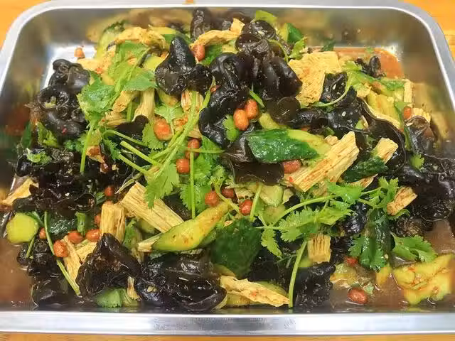1、把腐竹簡單的清洗一下,干木耳一把,也清洗過後,和腐竹倒在一起,用常溫水泡一個小時,千萬不能用熱水,很容易把腐竹泡爛。泡好後,把木耳切小一點,腐竹切成段備用。