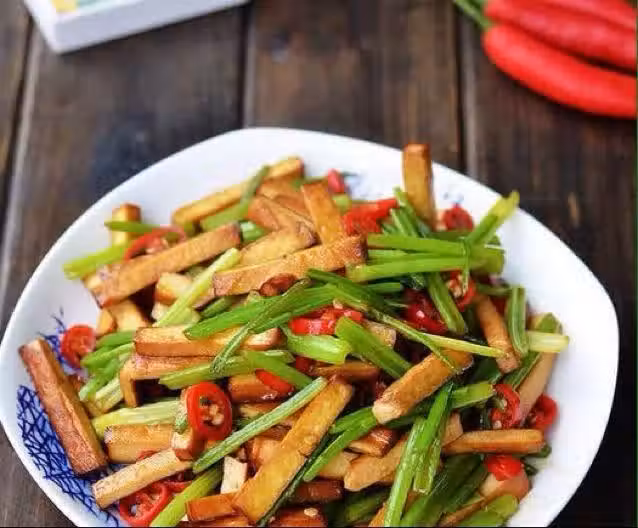 芹菜1把;豆腐乾6塊;食鹽1/2勺;醬油1/2勺;紅尖椒2個;植物油2湯勺