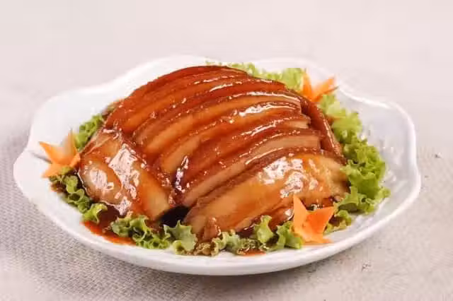 2、鍋上火,倒入清油,燒至八成熱,將五花肉皮朝下放入鍋中炸至呈深紅色,撈出晾涼,皮朝下放在枮板上,切成7厘米長、2厘米厚的大片,要把皮切斷;將肉皮朝下整齊地碼在碗內,肉上放梅乾菜,均勻倒入醬油,入蒸鍋蒸約30分鐘至肉軟爛,取出扣在盤子裡。