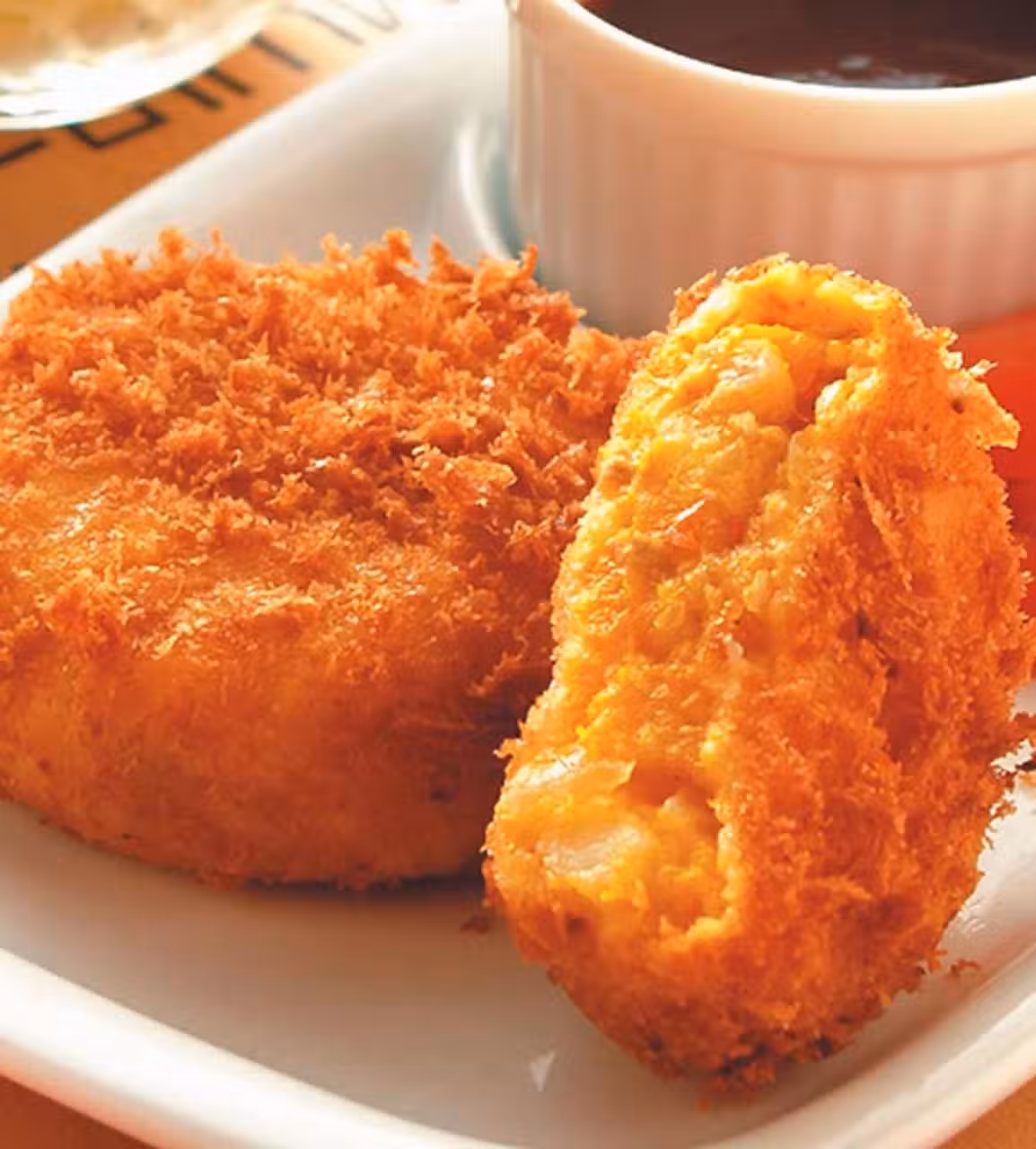 7 將作法4的南瓜可樂餅放入油鍋中,以中小火油炸至金黃色,即可撈起直立放在網架上瀝油。